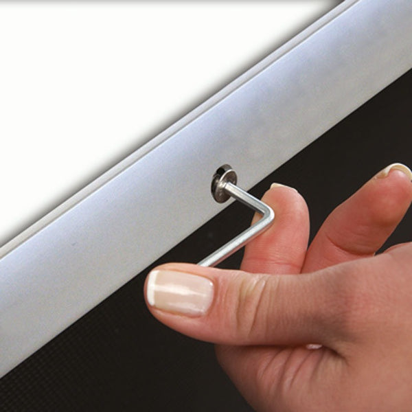 The Four Sides of the lockable frame open sequentially. The last profile is held in place with a screw on top that can be opened with its key. This system ensures your poster is never accessed by unauthorized third parties. Suitable for outdoor use. The product has water drainage holes (for details see assembly sheet). Anti glare poster cover sheet.